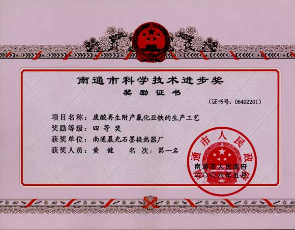 廢酸再生附產(chǎn)氯化亞鐵的生產(chǎn)工藝,榮獲南通市科學(xué)技術(shù)進(jìn)步獎,四等獎