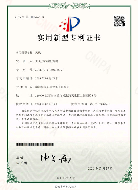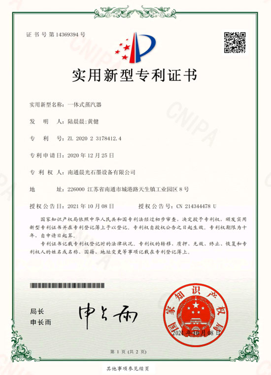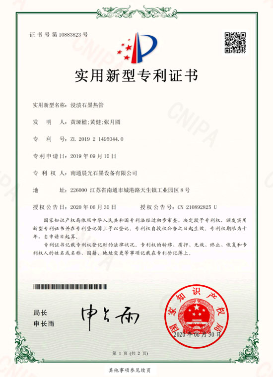 實用新型專利 :石墨換熱器 專利號:ZL 2019 2 1407837.2