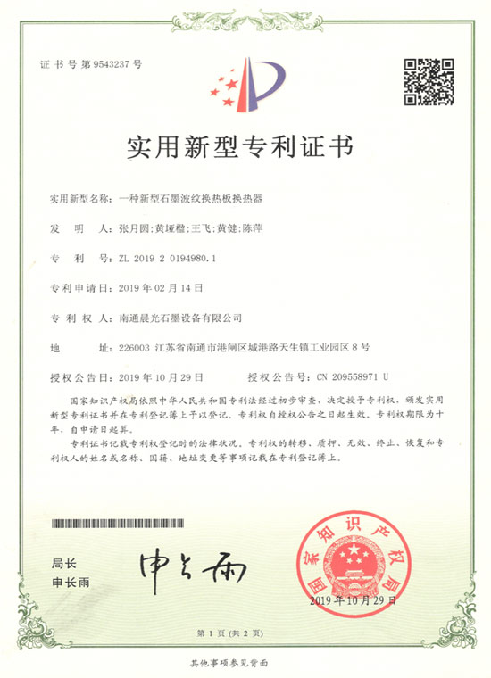 實用新型專利 :一種新型石墨波紋換熱板換熱器 專利號:ZL 2019 2 0194980.1
